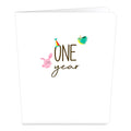 "One year" is written on the cover of this Playpop Card. Wish your little one a very happy first birthday with some party animal friends.