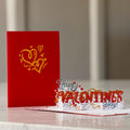 Golden hearts and wispy gold squiggles shimmer against a rich red background on the cover of this elegant pop-up card. Inside, the message 'Happy Valentine's Day!' explodes from the page in a vibrant melange of colors and shapes. While the words 'Happy' and 'Day' appear in looping gray cursive, the word 'Valentines' shimmers in three-dimensional red and gold lettering with miniature cut-out patterning. Tiny hearts float up around the letters, and loops of white and gold add a celebratory flair to the message. This pop-up card also features two-dimensional confetti curling around its edges