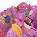 This handmade paper bouquet features vibrant purple clouds of candy floss bursting from a pink and white Honeydukes? canister that acts as a flower vase. A spattering of classic Honeydukes? treats peek out between the candy clouds, including Chocolate Frogs, packs of Drooble's Best Blowing Gum, and Bertie Bott's Every Flavor Beans. Colorfully wrapped candies, chocolate cupcakes, and orange, purple, and pink sugar quills also dance among the other treats. Additionally, there are cutouts of stars, moons, and intricate swirls in the clouds to add even more enchantment to the display. ?