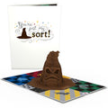 This charming 3D card reads 'You're just my sort!' on the white front cover, accompanied by the iconic Sorting Hat? and dazzling swirls and stars. Upon opening the card, the Sorting Hat? springs to life in 3D, as if poised to make its next decision and sort the recipient into their perfect Hogwarts? house. The inside panels feature the crests of the Hogwarts? founders - a griffon for Gryffindor, a raven for Ravenclaw, a badger for Hufflepuff, and a snake for Slytherin. ? Size: