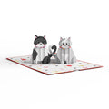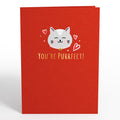 The front cover of this?love-filled pop-up card is a?cheerful red that is sure to catch anyone's eye. An adorable illustration of a smiling gray and white cat sits above a very punny greeting: "You're Purrfect!"?Upon opening, two pink cheeked kitties pop-up to greet your recipient with smiling, furry faces as they sit side by side, their tales intertwining to form a love heart. The cat on the left is a white cat with a black mask and splotches while the one on the right is a light gray with a white belly. The white background of this card features both love and cat themed doodles, including flowers, paw prints, and balls of yarn, as well as foil inlay hearts and polka dots.