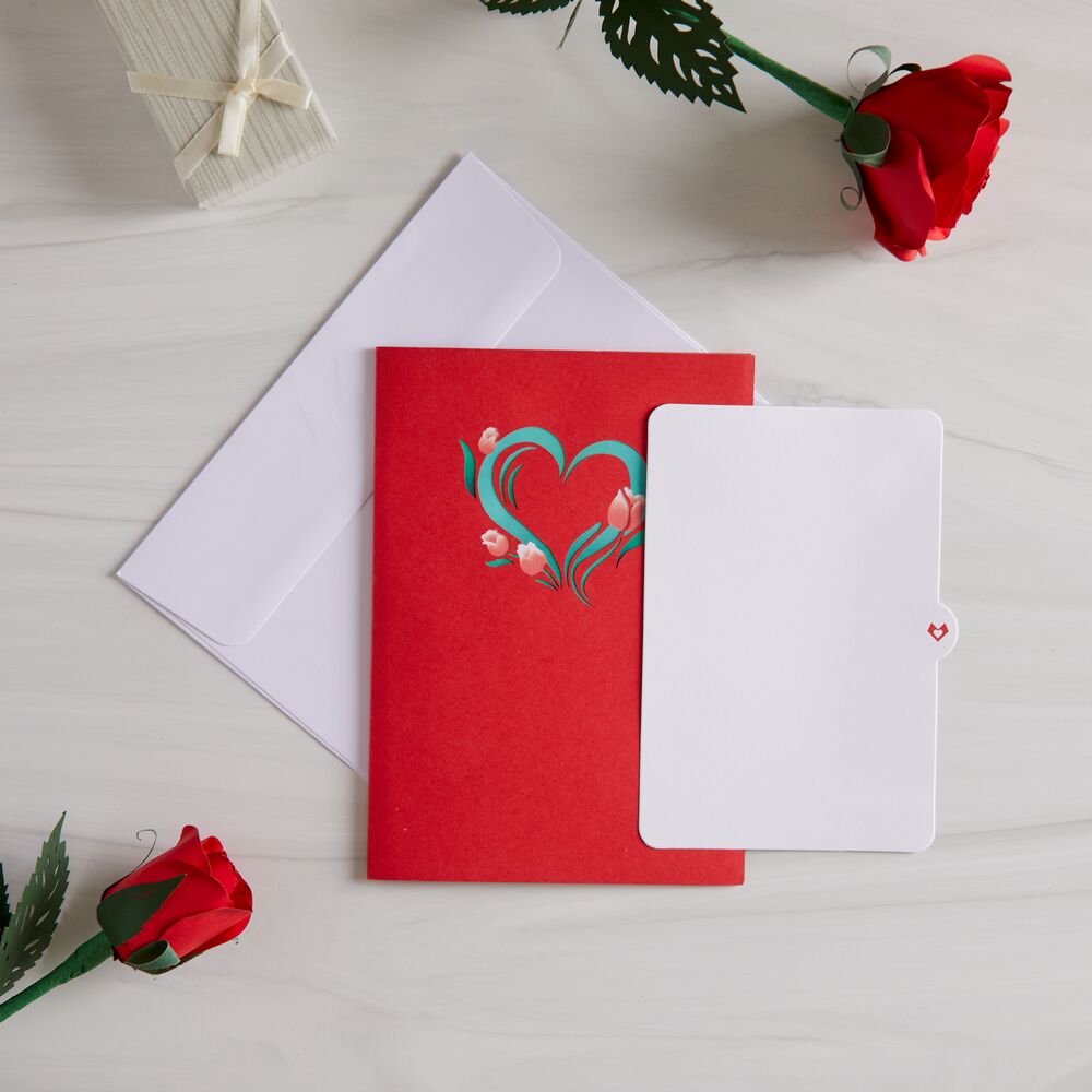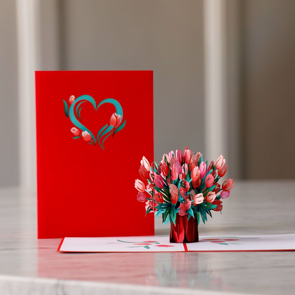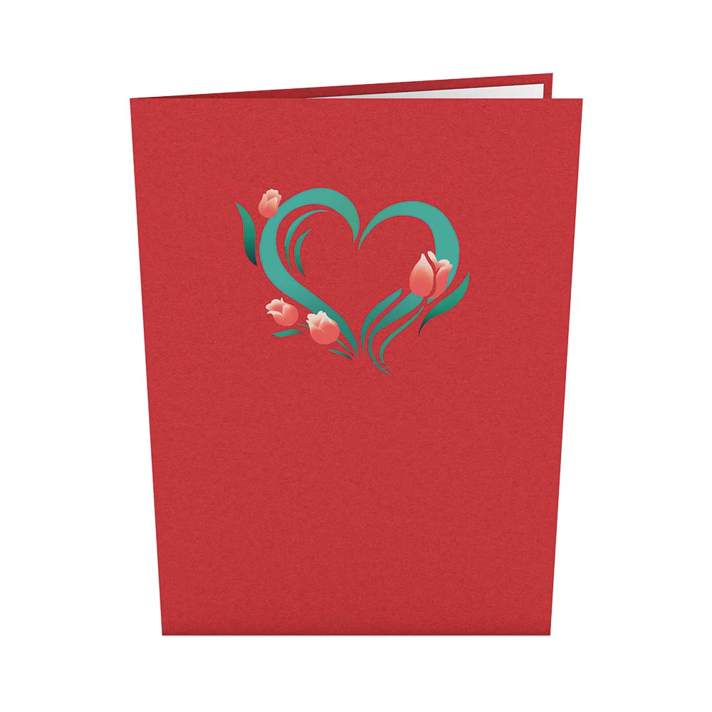 The front of this vibrant crimson greeting card displays an elegant illustration of a green heart, its curvature blending into the organic lines of leaves and rosy red tulip blossoms. Inside, a gorgeous paper flower bouquet pops out, the sturdy fuchsia vase holding a bundle of pink and red tulips, delicately handcrafted and 'blooming' from emerald green, leafy stems. On the simple white background, more florets and leaves surround the exquisite centerpiece