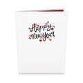 Red lanterns and cherry blossom flowers decorate the message "Happy New Year" on a white front cover. Once opened, an intricately designed cherry blossom tree elegantly stands representing the Lunar New Year. The branches of the Cherry Blossom tree are trimmed with red lanterns and red envelopes. "Good Luck and "Happy New Year" are laser cut onto each red envelope.