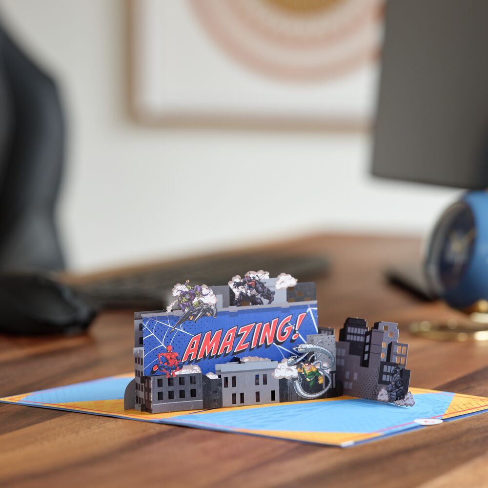 The deep blue front of this Marvel pop-up card showcases Spider-Man and the words "Dad you are..." in red and yellow letters. Inside, a 3D city scene jumps to life with gray buildings, one painted blue and red with the word "AMAZING!" to finish the sentiment from the front of the card. Spider-Man battles his nemeses among the laser-cut structures, with Doc Oc, the Green Goblin, and Venom springing to action. The inside cover is bright yellow and pale blue, featuring designs of the tops of buildings, prepped for Spider-Man to swing across