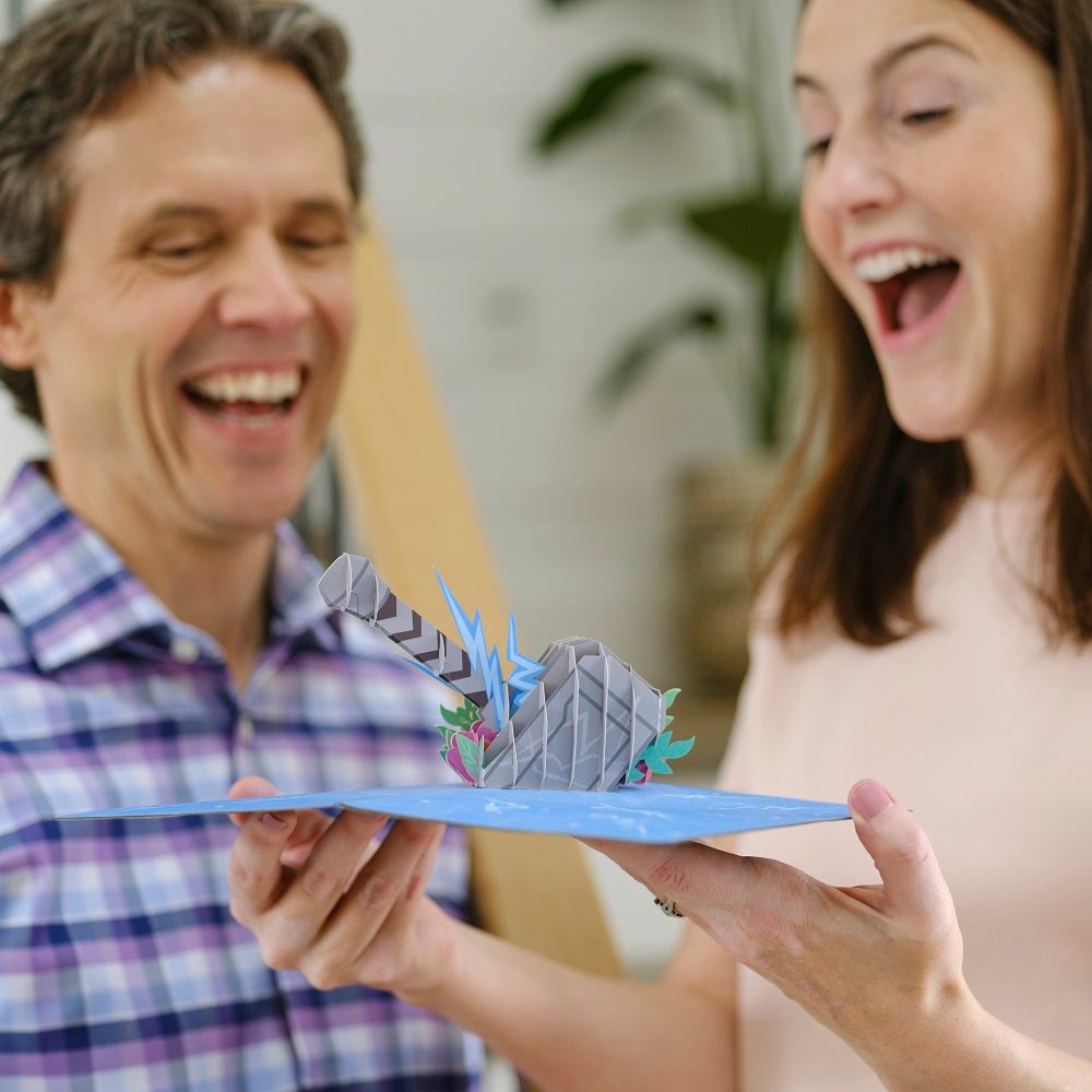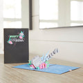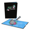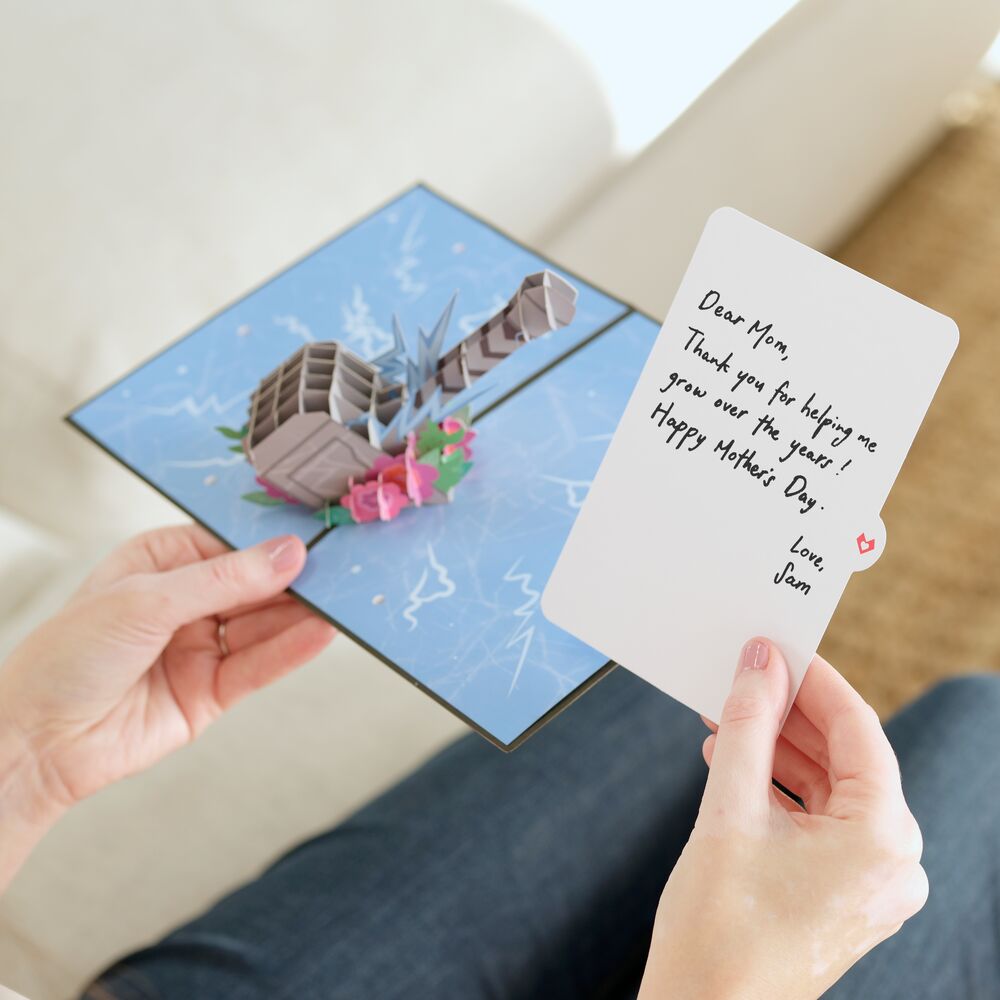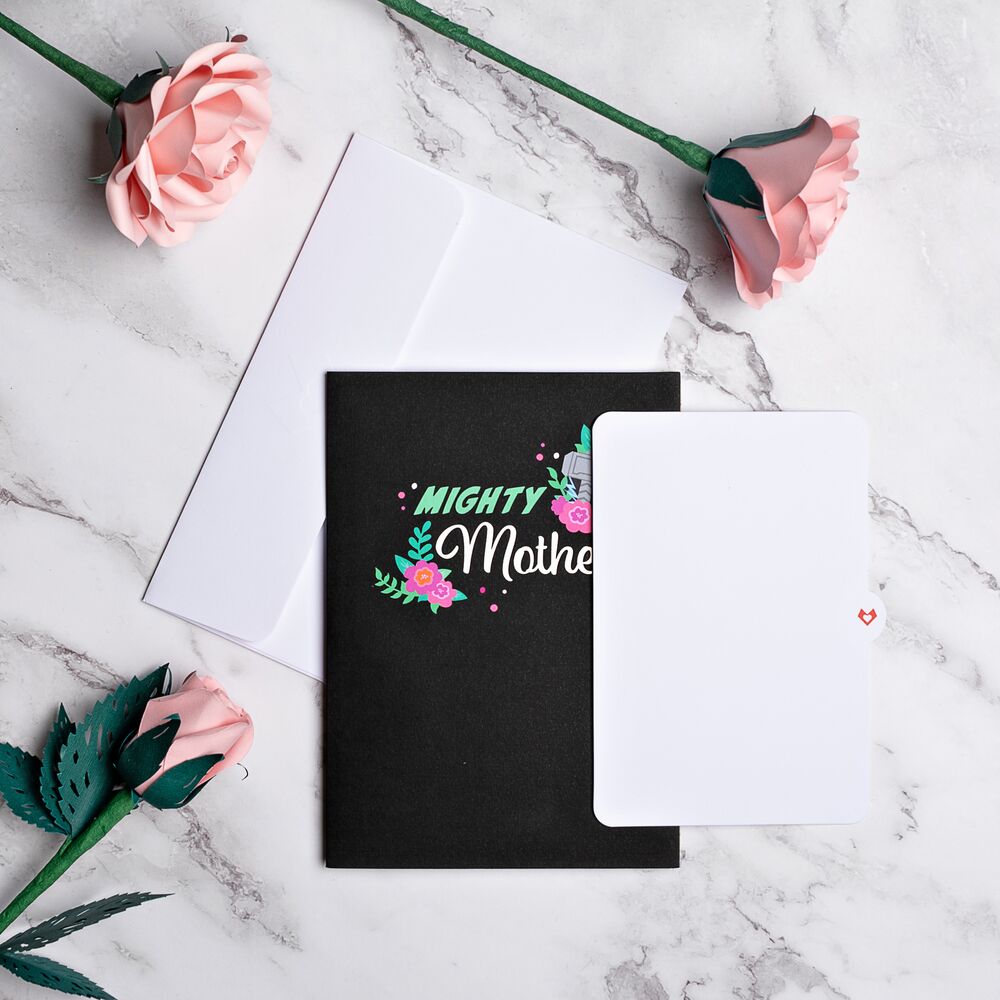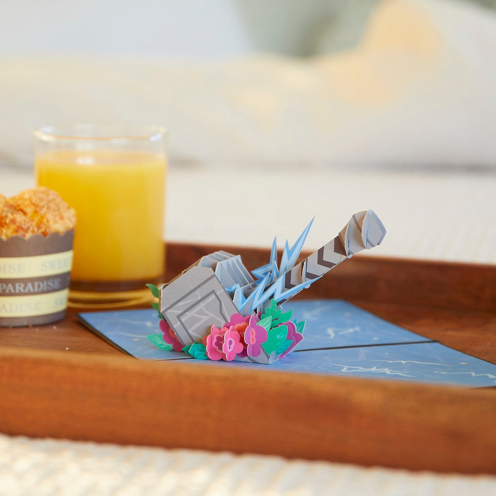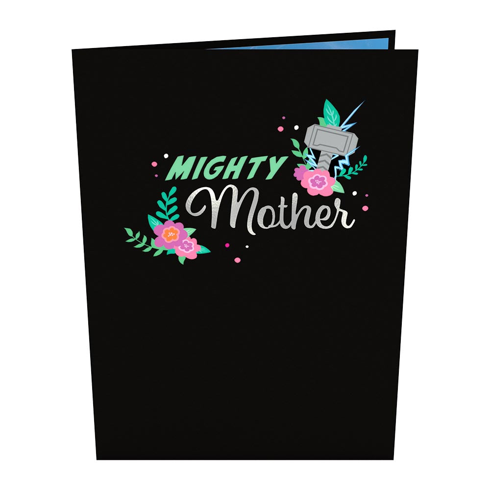 ¡°Mighty Mother¡± is written on the front cover of this Marvel Mother¡¯s Day pop-up card. Thor¡¯s hammer sits amongst pink and green floral elements. Upon opening, Thor¡¯s hammer strikes down, leaving blue electric lightning bolts to scatter everywhere on the inner panels of this design. Pink and purple flowers adorn the edges of the hammer.? Size: