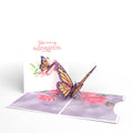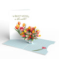 This unique greeting card features a large card that reads 'Best mom in the world...' with tulips on the front and in 3D inside. Three smaller cards nest inside it, the first reading 'Thank you for always being there for me' and featuring a 3D hummingbird. The next pop-out card says 'You are my inspiration' and showcases a brilliant monarch butterfly. The final card reads 'I love you!' on the front with a hydrangea bloom that jumps out in 3D inside the card with a message that says 'Happy Mother's Day' in bright pink lettering, surrounded by flowers.