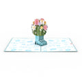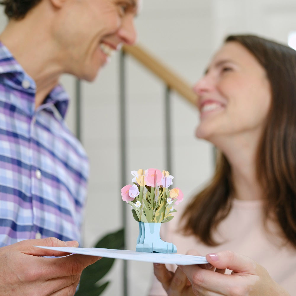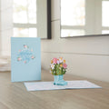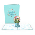 This card features a powder blue cover with the message 'Happy Mother's Day.' Around the message, delicate little bouquets of pink and white flowers with green leaves offer a hint of what awaits inside. When you open the 3D card, you're greeted with the charming pop-up image of a bouquet of flowers bursting from a pair of blue gardening boots. The bouquet includes flowers like roses, daffodils, tulips, and daisies in pink, yellow, purple, and white. The boots sit upon a white page with an endearing pale blue flower pattern.