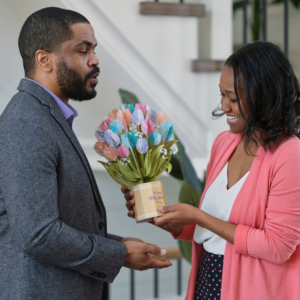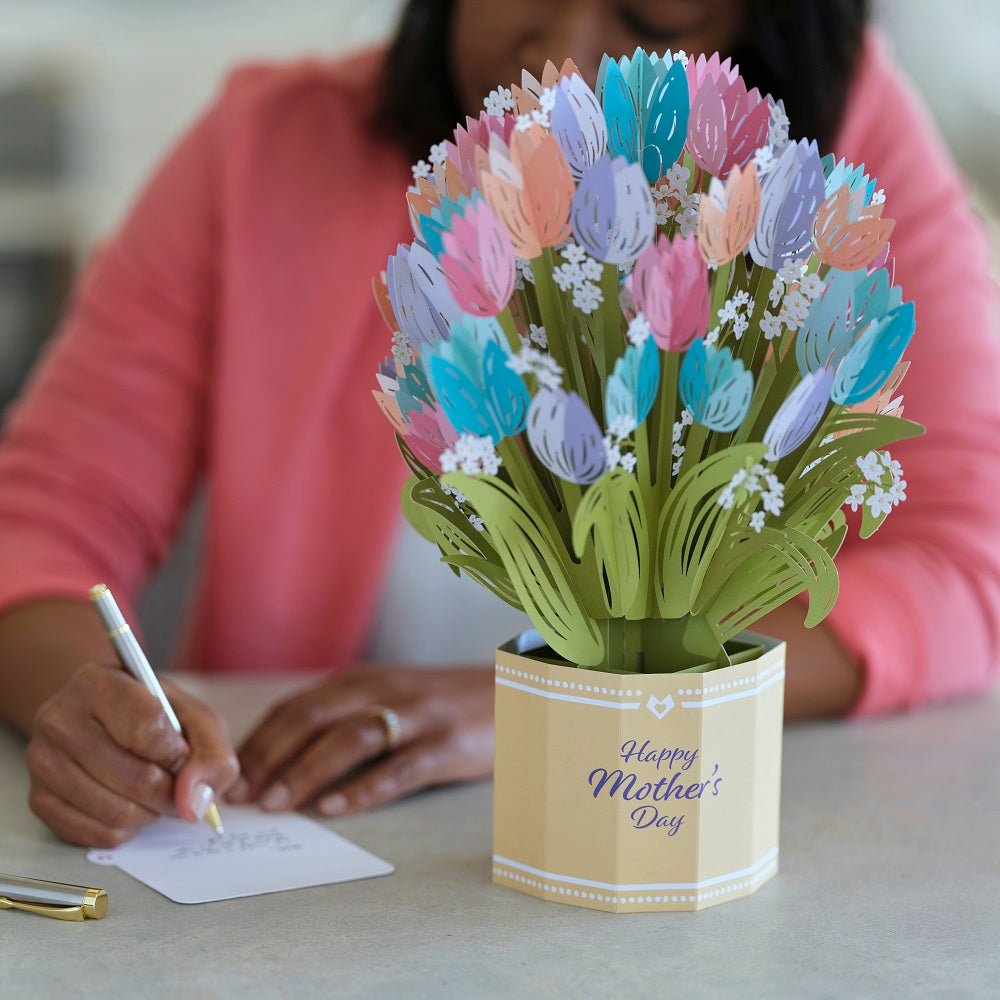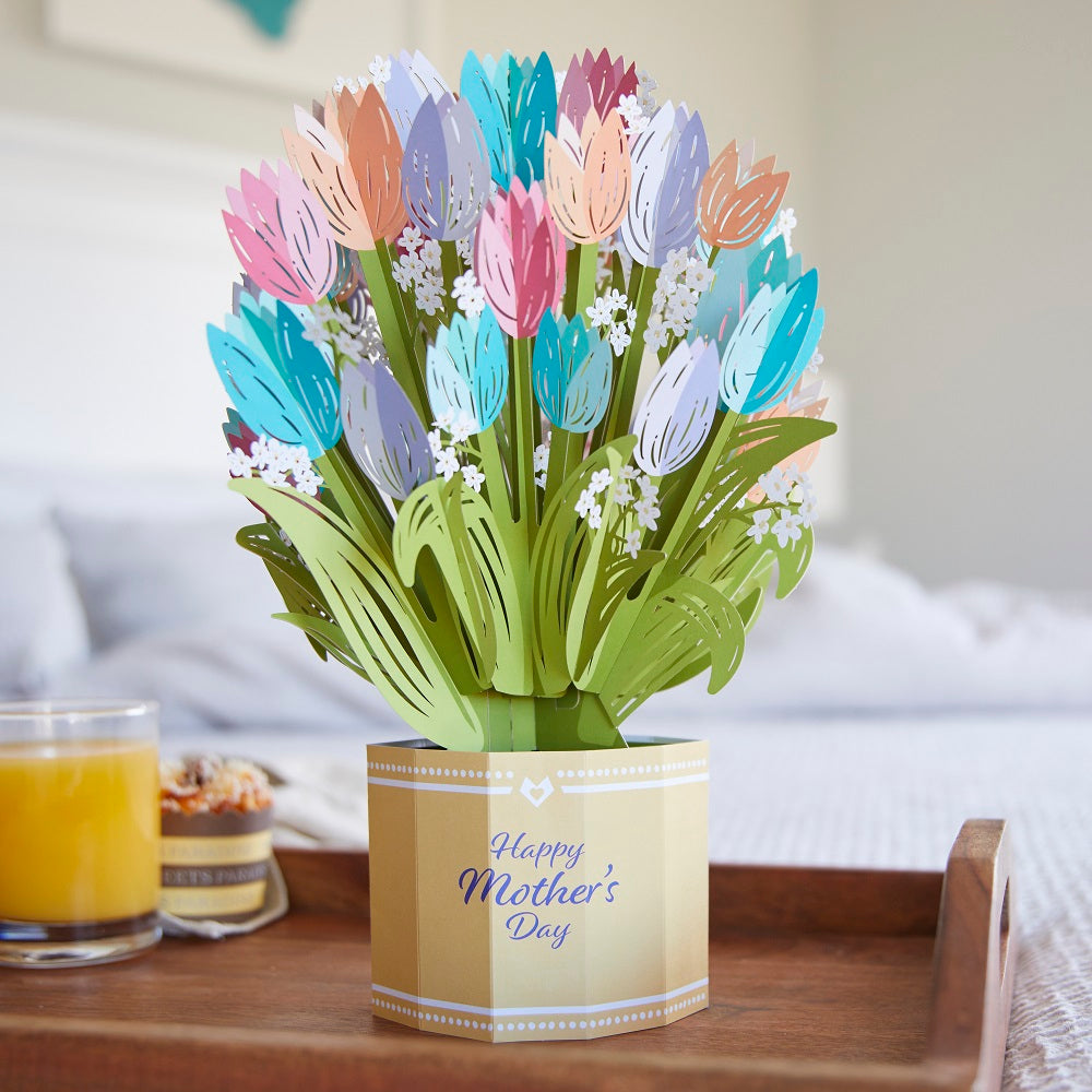 Quantity: One pop-up Mother's Day Tulip Grand Bouquet with a MicasShine Note, packaged in a secure box