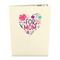 The?front cover of this cream colored card features a gorgeous heart design made of various colorful flowers, plants and petals, all surrounding the words "For Mom". Once opened, a petite 3D wicker basket of roses, sunflowers, daisies, poppies, hibiscus, tulips, snowberries, and many other types of flora pop out of the center, and a little "Happy Mother's Day" tag can be seen peeking out as well. The card's inner panels are a delicate gradient peach color,?with?spring and summer flowers, perhaps some peonies, can be seen blossoming from the corners. This beautiful and colorful display is lively and fun, while still being graceful, classy, and serene.