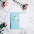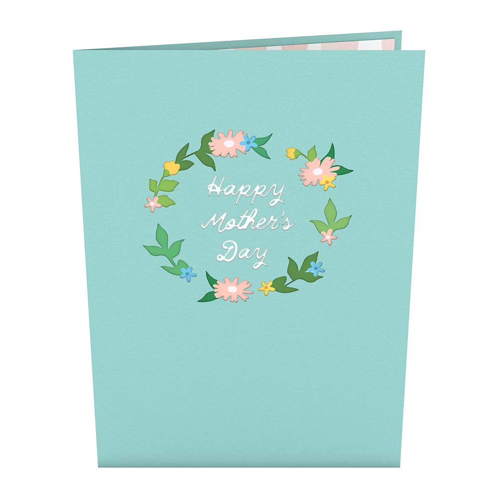 The front of the Mother's Day Daffodil Basket greeting card sports a ring of flowers with the words 'Happy Mother's Day' in cursive in the front. Open it up, and you'll see a base of white and pink stripes with a white basket in its center. The basket has a dark blue edge with a flower pattern of the same color and golden daffodils in various sizes, alongside daisies, forget-me-nots, and green and dark blue leaves. sits inside.