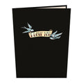 This black pop-up card features two classically styled bluebirds flying around a banner inspired by classic American tattoos. When you open this card, you're greeted with a tattoo heart popping out of the card that has those same two delicate bluebirds visiting. Two rich red roses peek out from behind the heart, creating a striking scene reminiscent of American-styled tattoo artwork.