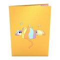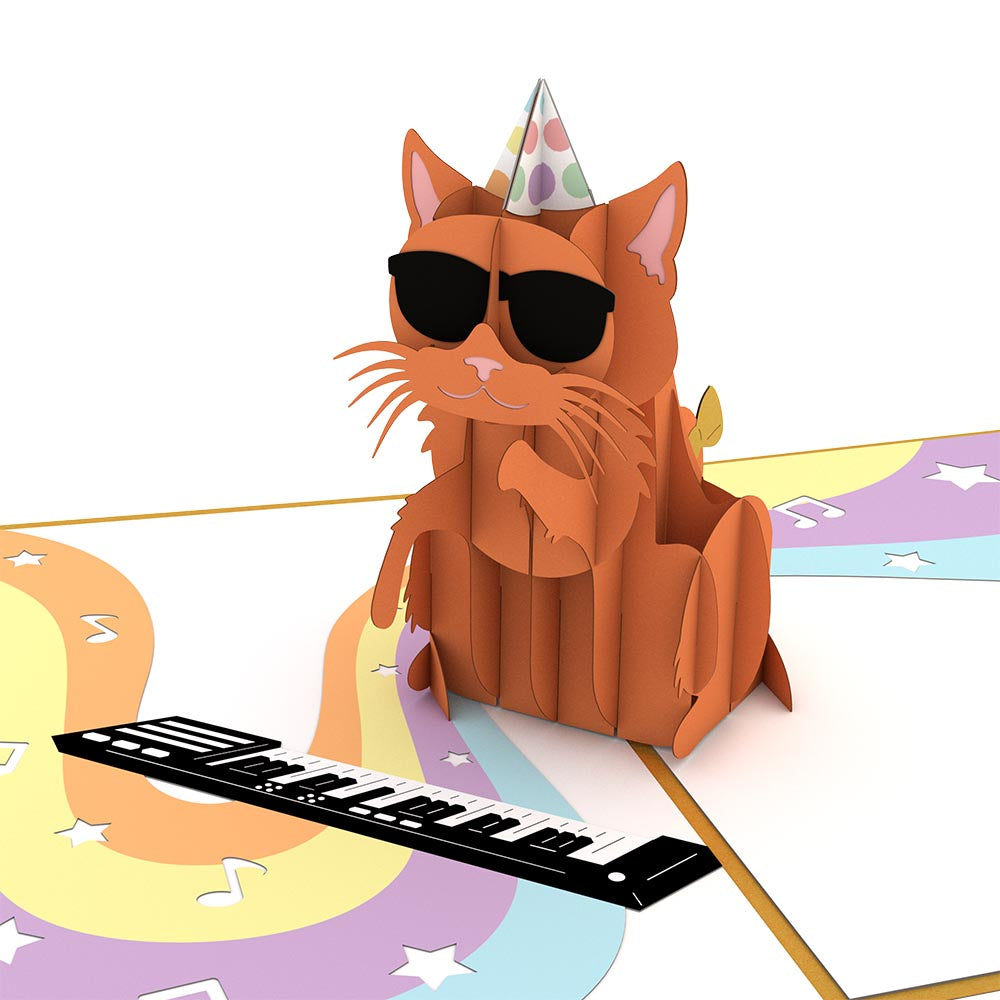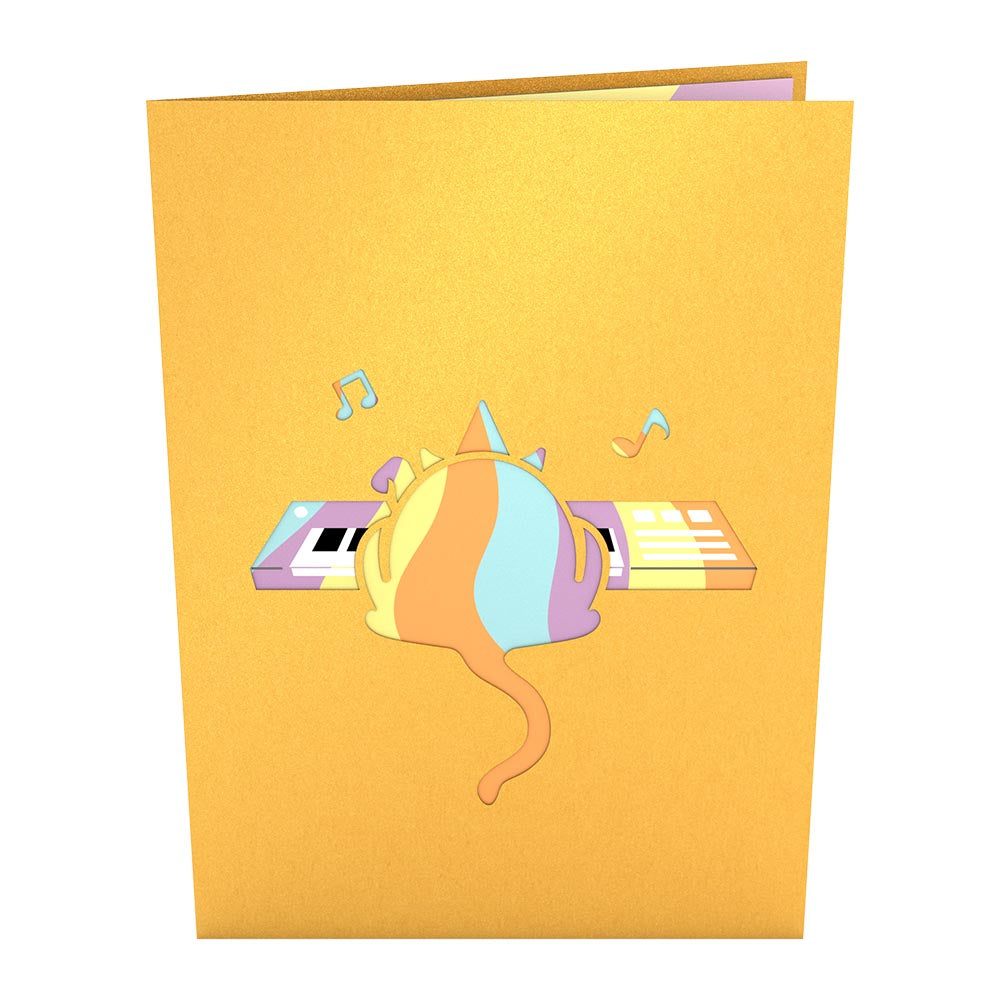 The yellow cover of the Party Cat pop-up card features a laser-cut cat playing away on an electric piano printed in a rainbow-like pattern!