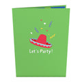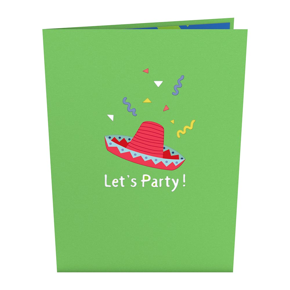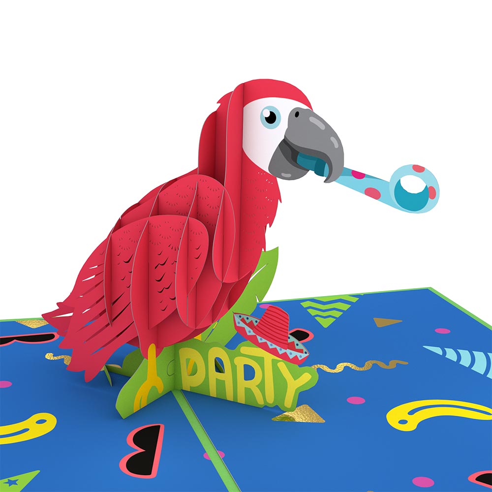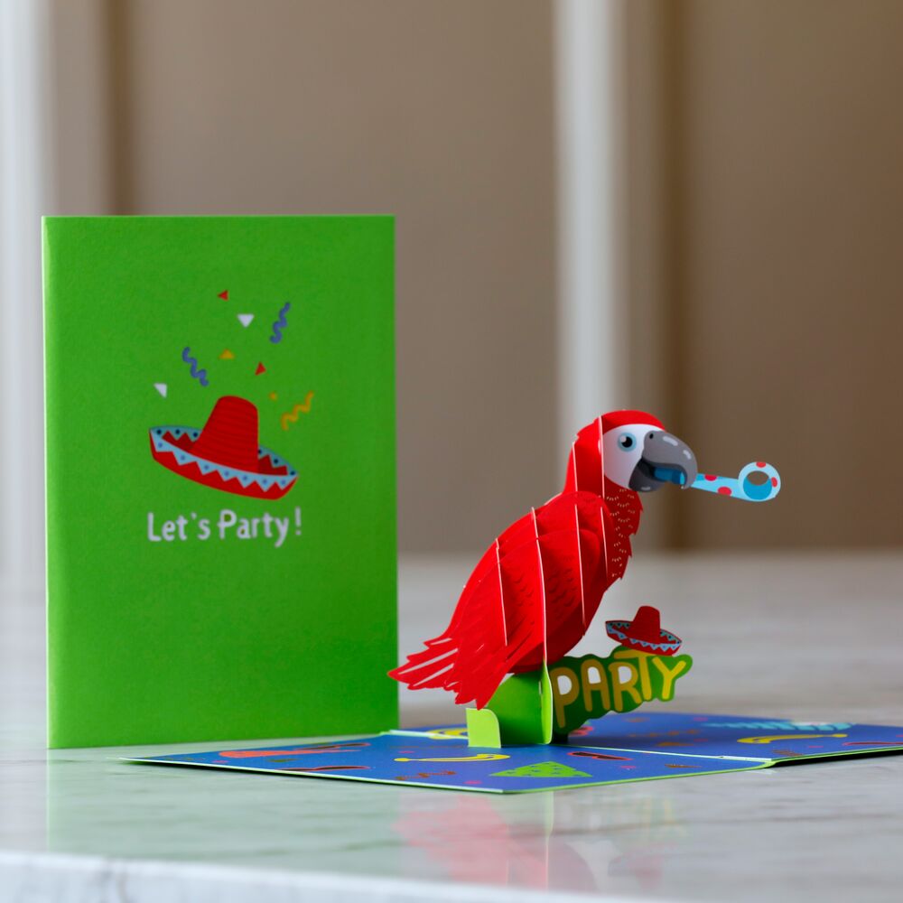 A bright red sombrero greets you on the bright green front cover of this pop-up card, inviting you to join the celebration with the phrase 'Let's Party!' and fluttering confetti. Upon opening, a brilliant red 3D parrot springs up from the card, holding a party noisemaker in its mouth. The parrot perches on bright green leaves that showcase the word 'PARTY' in yellow lettering, with a red and blue sombrero tilting on top. The scene sits on a deep blue inside cover, patterned with party supplies like hats, sunglasses, and confetti. Size: