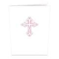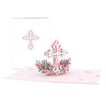 Give the gift of everlasting love with the Pink Floral Cross pop-up card. This stunning card begins with quite a simple exterior. The outside of the card is white with an intricate pink cross on it. Once you open the card, there's nothing simple about this gift. The base is pastel pink with greenery speckled across the background. The centerpiece of the card is the pop-up pink cross with a white border that creates a beautiful design. This cross sprouts from a crown of 3D flowers and leaves, adding a hint of floral to the card.