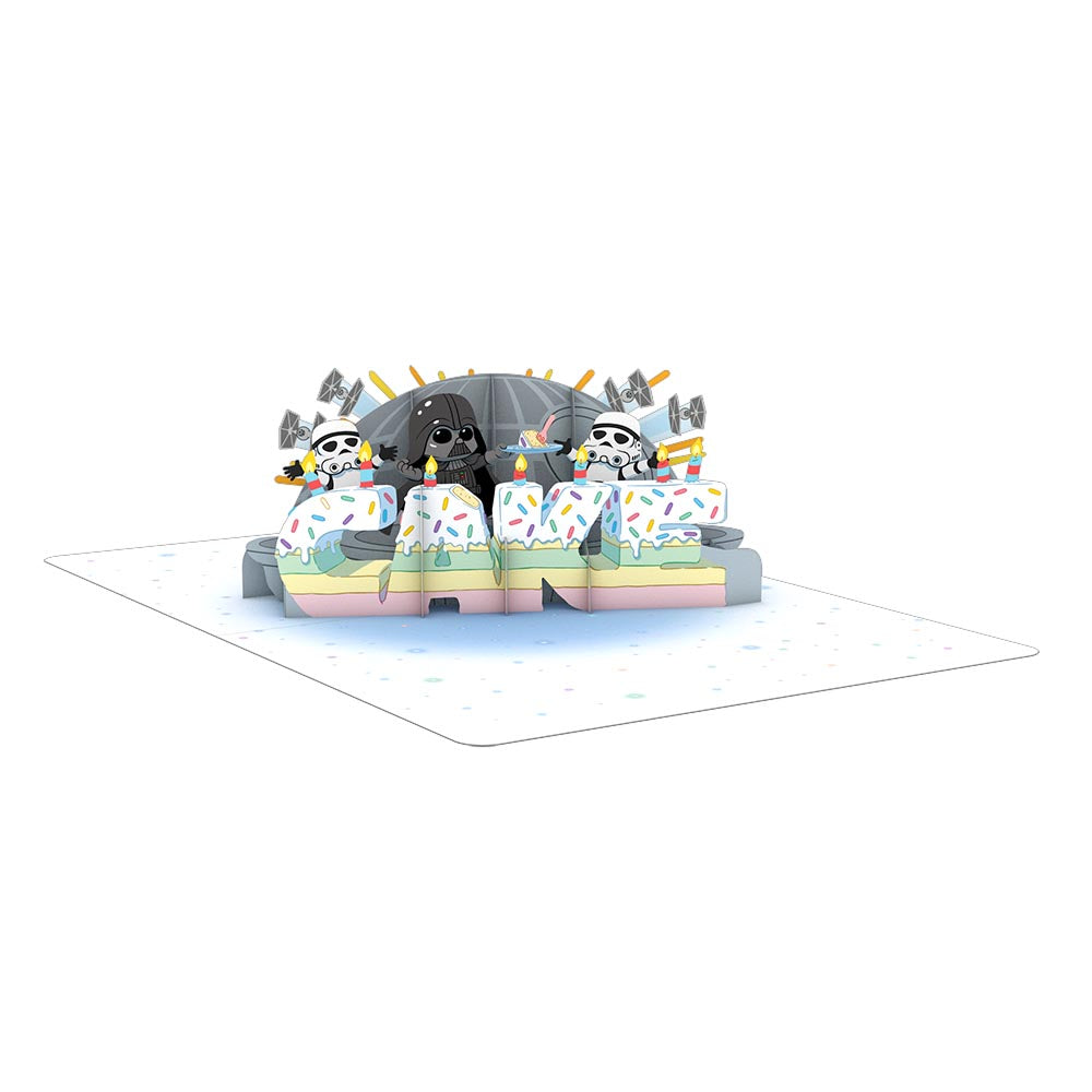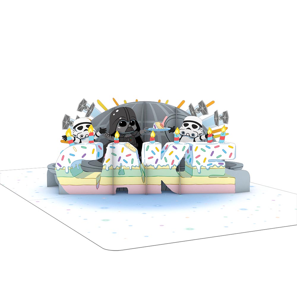 The cover of this galactically cool birthday design reads ¡°Your destiny is¡¡± Upon opening the message is finished with the word ¡°CAKE¡± in big pop up letters, which is actually a cake with candles! The sweet, celebratory sentiment is surrounded by Darth Vader?, two stormtroopers, the Death Star??, and tie fighters, too. Command any party with this galactically cool birthday card for kids of all ages!? Quantity: One Playpop Card with one blank envelope MicasShine Note: Playpop Cards do not include a pull-out MicasShine Note like our standard cards do.