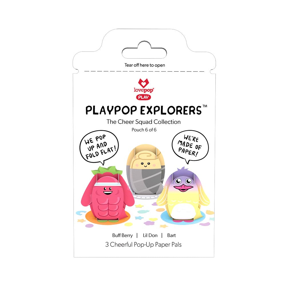 MicasShine first came to life with an imagination meets engineering approach to designing incredible paper art. Now, we've used that same technique to create a magical line of paper toys called Playpop Explorers??.?These cheerful 3D paper pals pop up and fold flat, making them the perfect collectibles for creative play and on-the-go fun. The Cheer Squad Collection (Pouch 6 of 6) includes: Size:?Each Playpop Explorer stands 3 inches tall by 2 inches wide when fully unfolded. Collect all 18 Explorers from the Cheer Squad Collection to unlock an exclusive bonus Explorer!?Enter?the Explorer Codes hidden within the base of your Explorers at?MicasShine.com/bonus.?