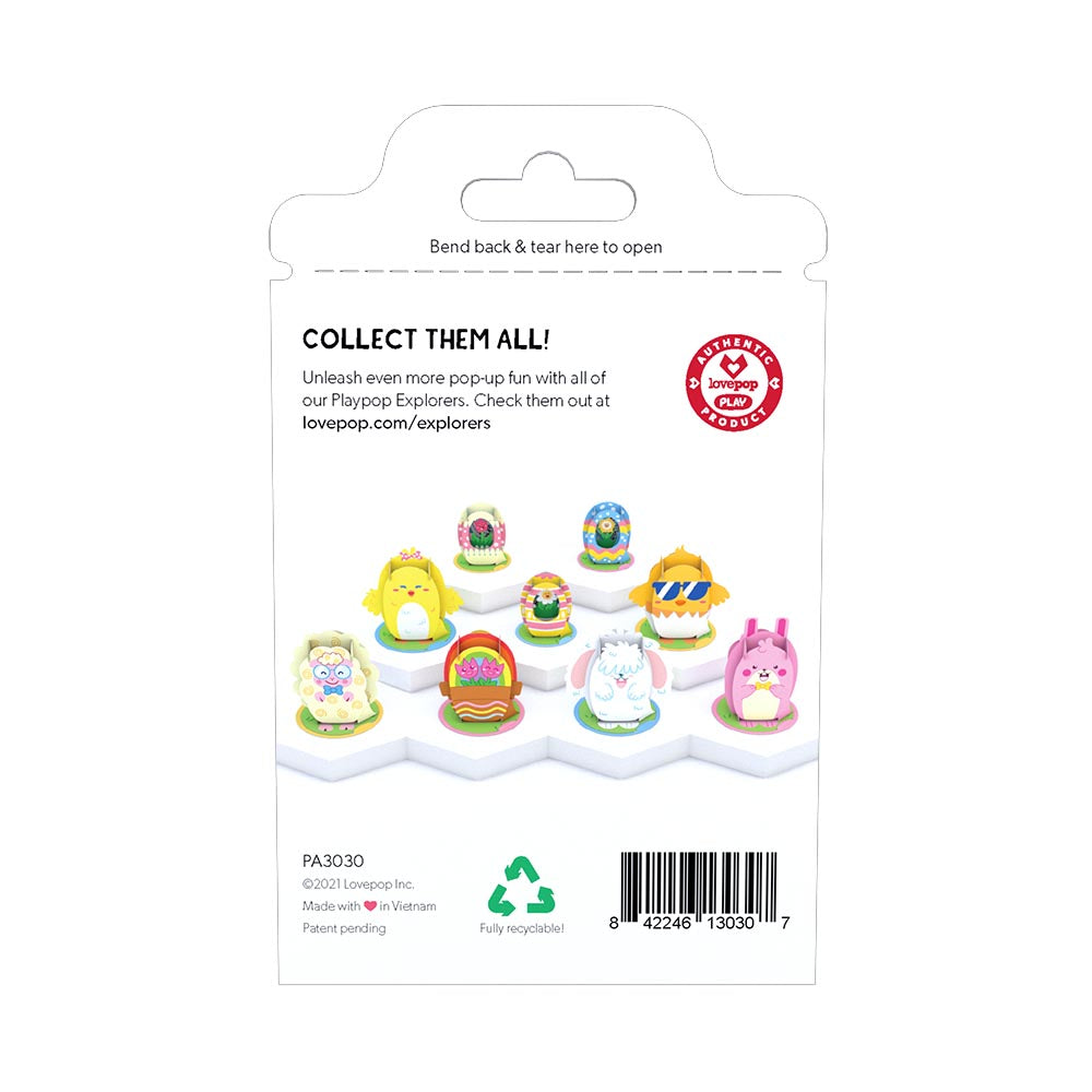 MicasShine first came to life with an imagination meets engineering approach to designing incredible paper art. Now, we've used that same technique to create a magical line of paper toys called?Playpop Explorers??.?These cheerful 3D paper pals pop up and fold flat, making them the perfect collectibles for creative play and on-the-go fun The?Hoppy Bunch?(Pouch 3 of 3) includes: Shop all Playpop Explorers Size:?Each regular Playpop Explorer stands 3 inches tall by 2 inches wide when fully unfolded (2 per pouch) and each mini Playpop Explorer stands 2 inches tall by 1.5 inches wide when fully unfolded (1 per pouch)
