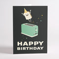A slice of white bread sporting an orange striped hat pops out of a pale green toaster on this birthday card. With its hands in the air and a giant smile on its face, the toast appears happy to be celebrating another year of life of someone special, and the green and yellow sparkles add a festive glimmer to the dark background. The cover text reads: 'Happy Birthday,' and continues on the inside with 'hope it's poppin'.' The greeting card leaves ample space for you to explain how much you want your loved one to experience birthday glee. ? Front Message: HAPPY BIRTHDAY Inside Message: hope it's poppin'. Size: ? Quantity: