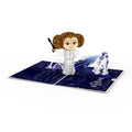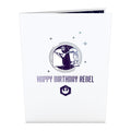 "Happy Birthday Rebel" is written across the front of this white card. A laser cut image of Princess Leia giving her message to R2-D2 can be seen along with the Rebel Alliance symbol on the front cover of this design. Upon opening this card, an animated Princess Leia and R2-D2 pop-up. "May the Force be with you" is written alongside intricate star and orbit patterns, decorating the background of this galactic design.