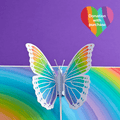 A rainbow laser-cut butterfly adorns the white cover of this pop-up card. Upon opening this design, a colorful butterfly appears ready to flutter away. The butterfly's white body and wing detail contrast the otherwise rainbow coloring of this design. The male and female symbols appear on the underside of the butterfly's wings. The background is beautifully illustrated with a rainbow watercolored stripe pattern.