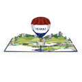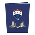 The front of this dark blue pop up card features a detailed illustration of the RE/MAX balloon floating high above a collection of homes and skyscraper buildings.