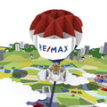 Upon opening this card, the red, white, and blue RE/MAX Balloon pops up in front of your eyes. Floating in the clouds high above your new city, the RE/MAX balloon provides a glorious view of your new soon-to-be home. Will you live on top of a hill, in a towering skyscraper, along the winding river, or in the far-out suburbs?