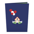 A quaint little home sits upon the dark blue cover of this pop-up card. Red and white balloons are tied to the white picket fence surrounding this home.