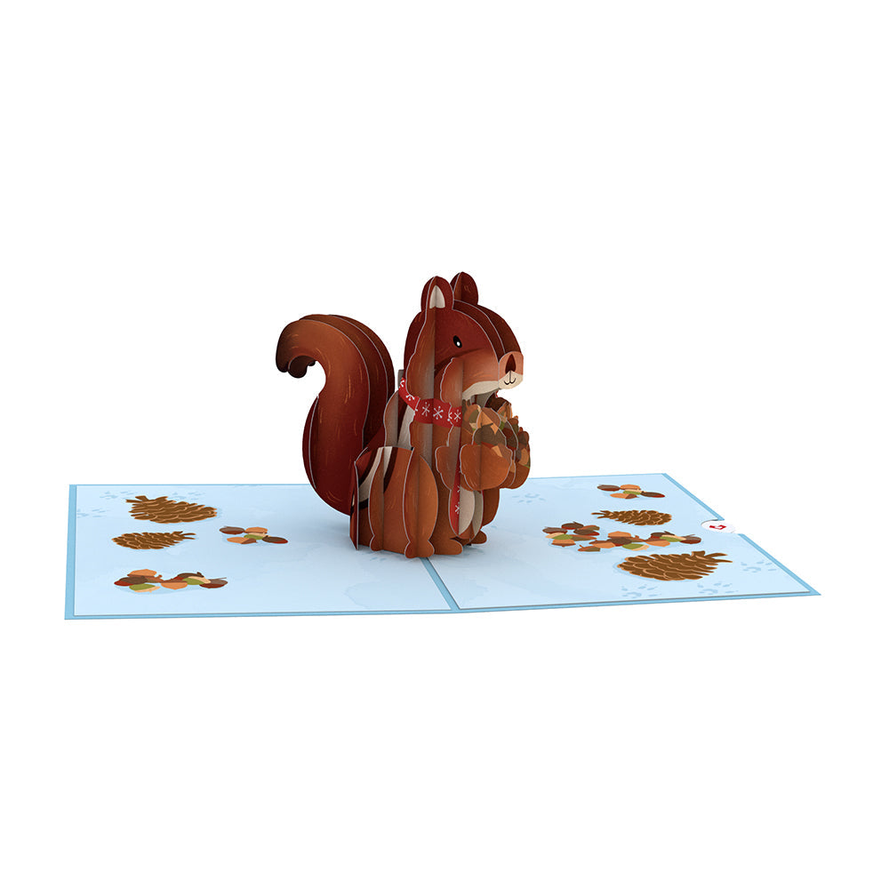 A brown chipmunk stocks up on acorns for the winter in the pop-up of this greeting card. The furry creature uses a red scarf with snowflakes to keep warm from the blistering cold, and it carries as many nuts as it can manage in its arms. Surrounding the chipmunk are more goodies it may like, including pinecones. The cursive text on the front cover of the paper card sends a reminder for the upcoming holiday season as a cheery chipmunk frolics under the snowflakes. ?