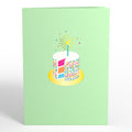 The pale green front cover of this unique birthday card shows a colorful birthday cake with pink, orange, and blue layers inside and rainbow sprinkles on the outside. A striking birthday candle erupts from the top of the cake, emitting sparks and confetti. Inside the card, the cake stands up in 3D, its sprinkles popping with brilliant color against the white icing. The top of the cake holds letter-shaped candles that spell out 'Happy Birthday.' On the inside cover, birthday supplies scatter among confetti, including party hats and gifts