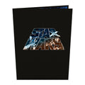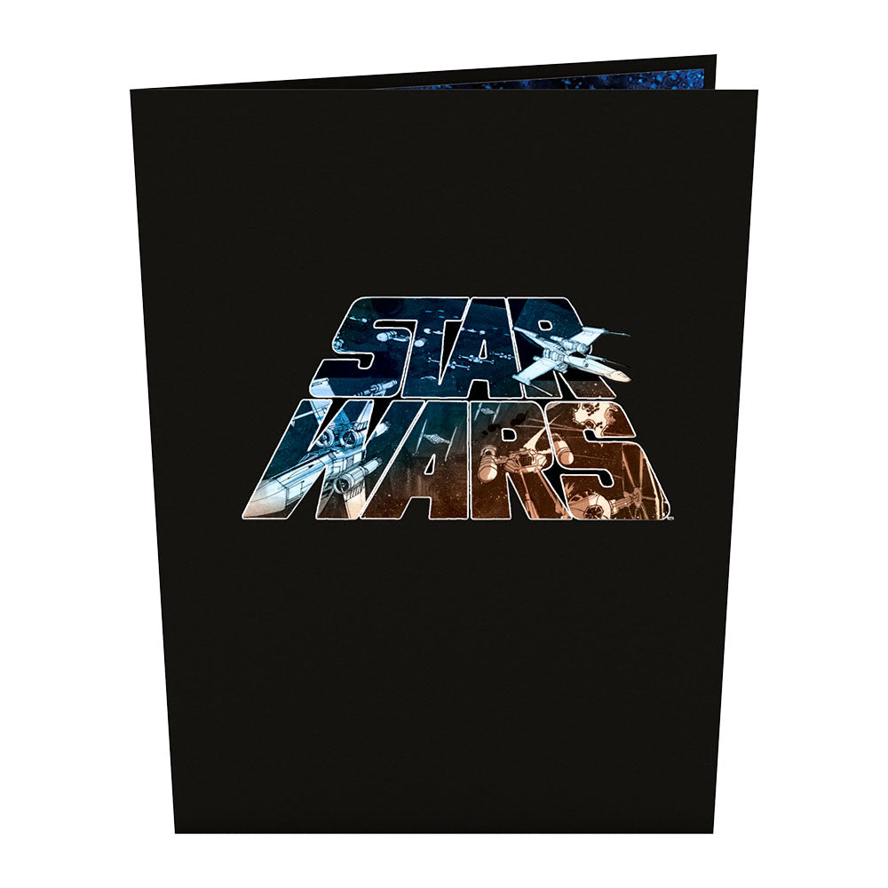 The black cover of this pop-up card features "Star Wars" written in the opening crawl style. The iconic Star Wars: A New Hope? poster imagery appears right before your eyes upon opening this design. Princess Leia? and Luke Skywalker? stand in front, with both R2-D2? and C-3PO? lingering behind them. The black helmet of Darth Vader? and the Death Star make up the background of this galactic design.