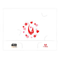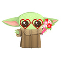Grogu?? stands with his three little fingers held out, ready to use the Force??. His other hand is holding onto a bouquet of pink red and white flowers, perfect for any love-filled occasion. Red metallic heart-shaped glasses rest on his face, ready to celebrate love.