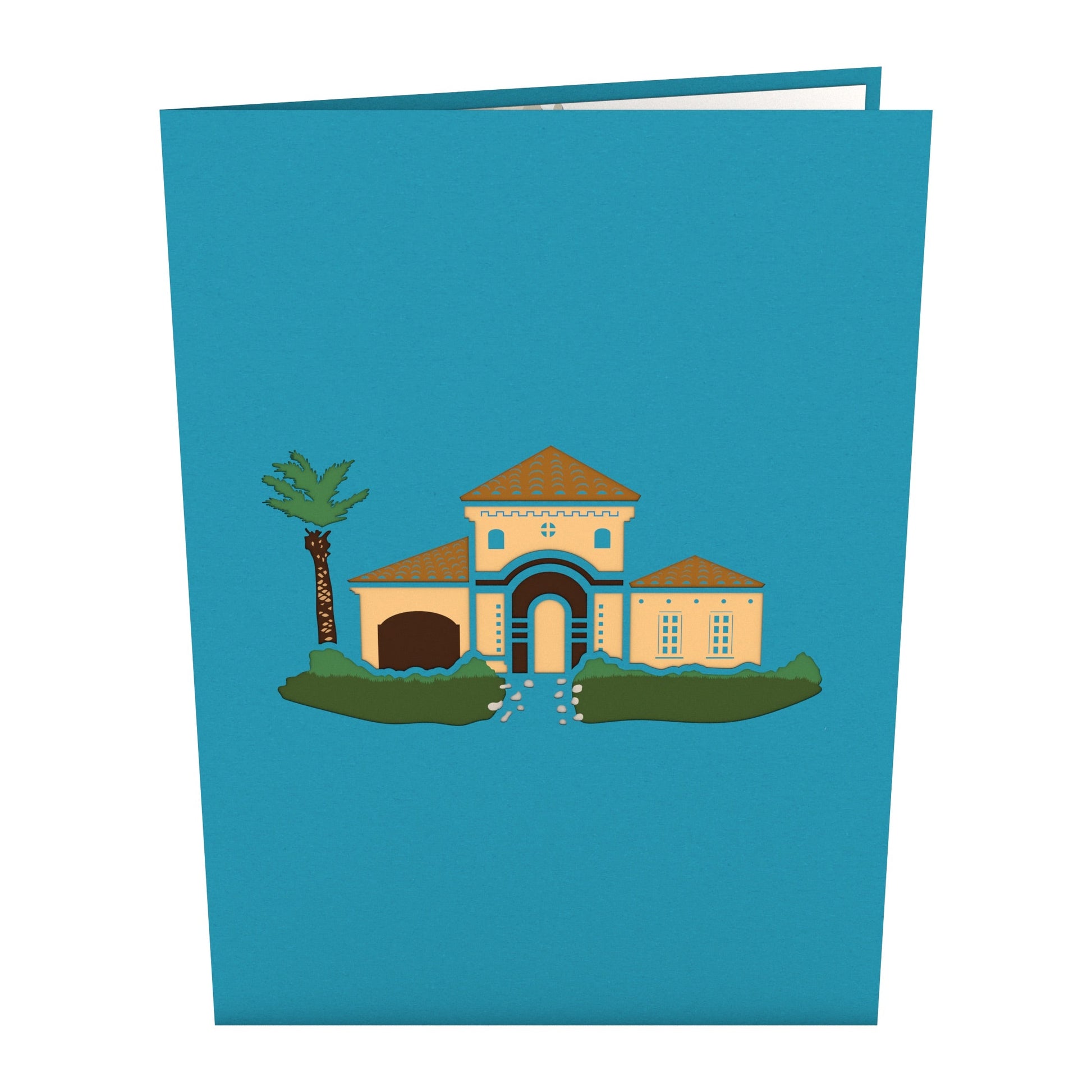 The front of this teal card features a beautiful tan and brown stucco roof house. The luscious green front lawn and a lofty palm tree make this home extra inviting. Upon opening this design, a grandiose house appears before your eyes. A bright red "SOLD" sign towers over the side of this home. An elegant white stone walkway leads up to the front door of this large home, surrounded by well-maintained landscaping.