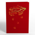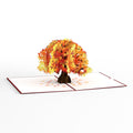 The cover of this beautiful?pop-up card is red and adorned with an illustration of the branch of a Maple Tree just starting to shed its leaves. Once opened, an intricate Sugar Maple Tree is pops up from the center. As the fall season sets in, the leaves have turned a gorgeous array of yellow and orange.?The card's inner panels are?embellished with laser-cut maple leaves.