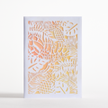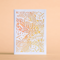 This colorful greeting card reads 'Have a sweet birthday' on the front cover in zany white lettering. Tropical plants, birds, and fruits dance around the message, complete with sweet pineapples, parrots, and toucans to join in on the birthday celebrations. Massive leaves flap around in the background, filling out the tropical scene. All the bright white laser-cut details stand out against the marbled yellow and orange background.