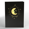 The black front cover of this pop-up card reads 'Hey Virgo' in thin gold cursive, accompanied by stars, the Virgo symbol, and a winking crescent moon. When you open the card, a brilliant 3D display showcases a woman's silhouette in dark blue with golden hair, surrounded by stars and the different phases of the moon's cycle. A night sky appears on the inside cover, with a deep blue background and white and yellow stars flickering into view. The Virgo constellation stands out among the other stars, and a message that says 'Happy Birthday' shines in gold. ? Size:?The Virgo Zodiac Birthday pop-up card is 5 inches wide by 7 inches tall. Quantity:?One MicasShine with one blank envelope and the MicasShine Note, a little note card that slides away with your own personal touch