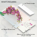 - Graceful Orchid Design: The front cover displays a delicate orchid branch, hinting at the elegance within. Inside, an intricate 3D arrangement of pink, purple, and yellow orchids blooms beautifully, capturing the natural splendor of these flowers in an unforgettable display.